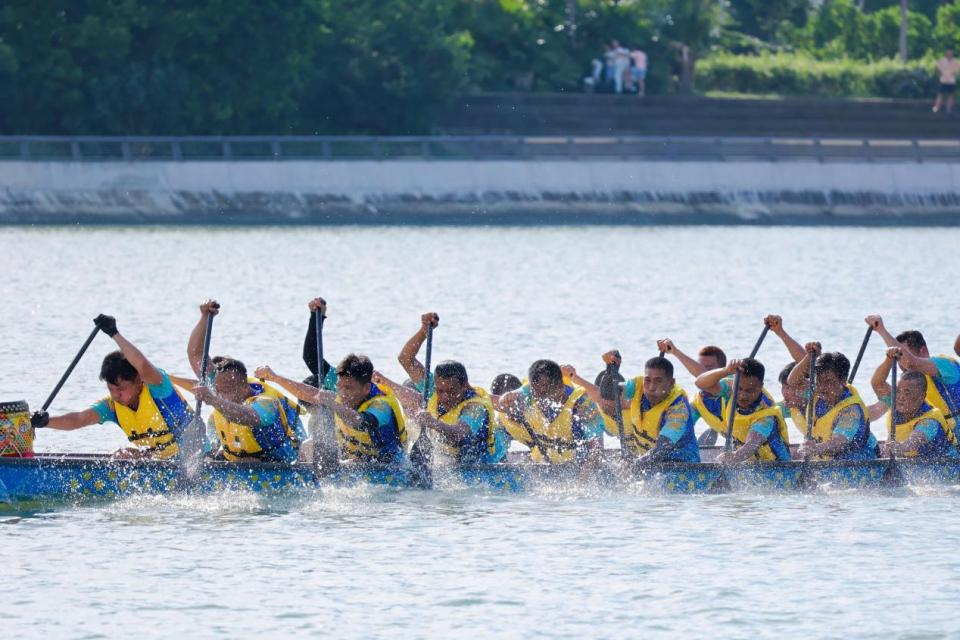 8月9日下午,2025美兰渔村龙舟赛第二场周赛在海口美兰区新埠岛星海湾水岸风情街水域火热启幕。