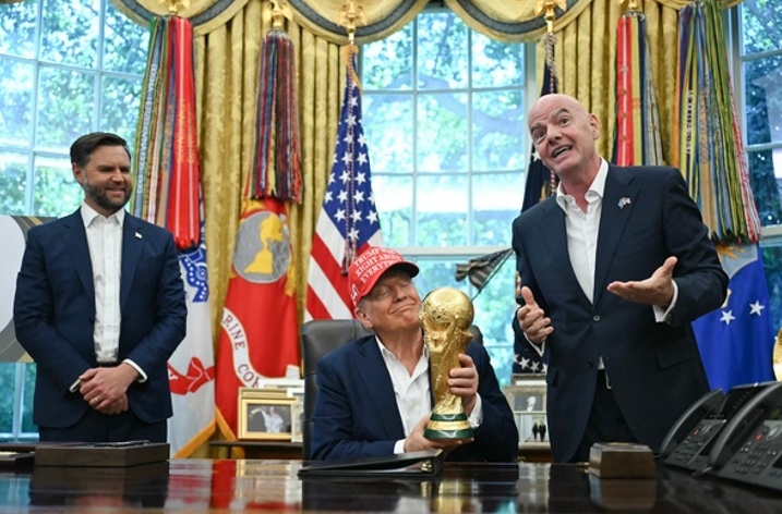 当地时间22日,美国总统特朗普在白宫接待国际足联主席因凡蒂诺(右)时,手握“大力神杯”。图源:美媒